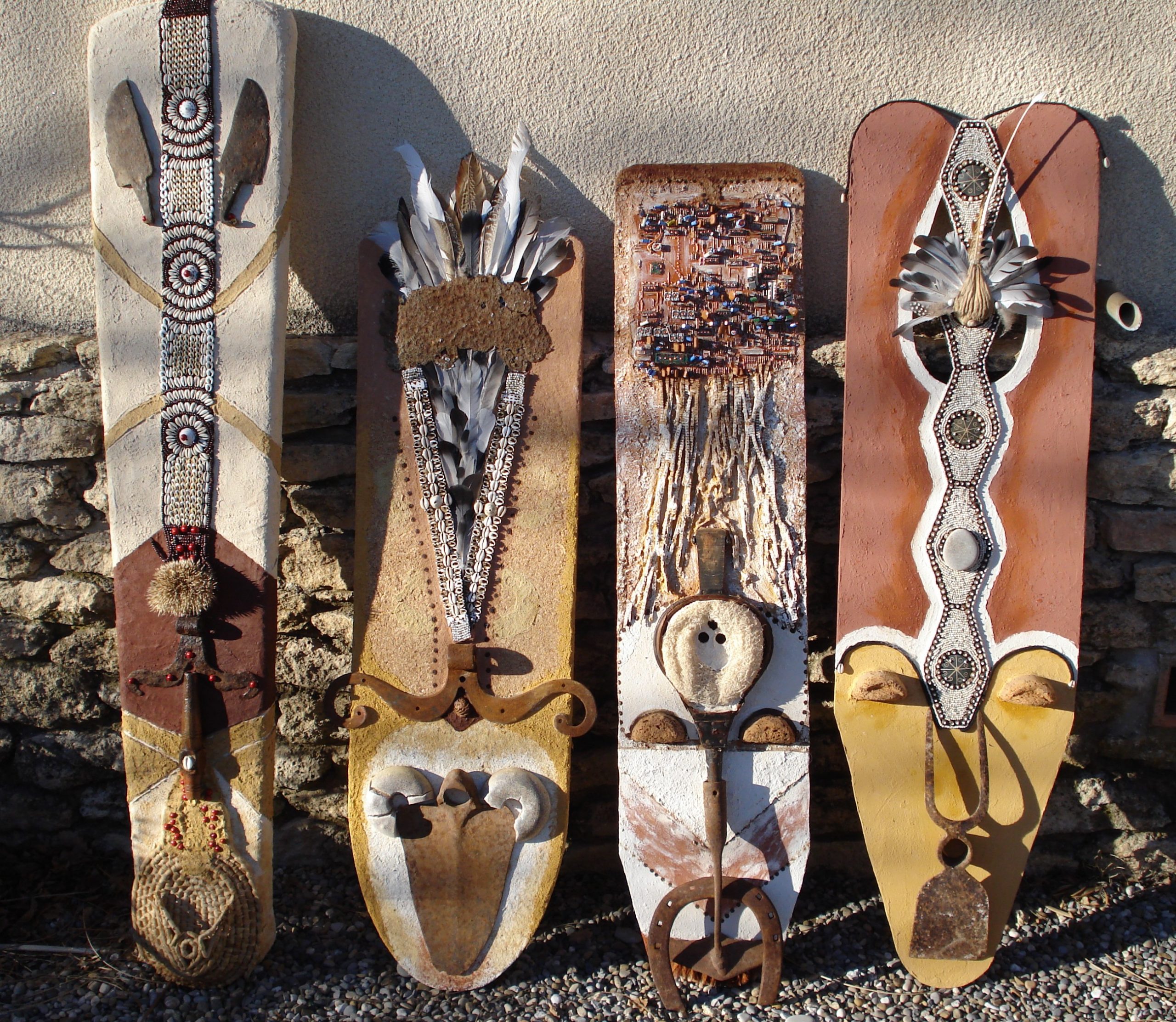 Elles sont faites de coloquintes, terres cuites, graines sculptées, bois, racines, ossements, fer forgé ou soudé, coraux et autres trouvailles issues de mes pérégrinations (les végétaux sont stabilisés à la gomme laque si besoin).