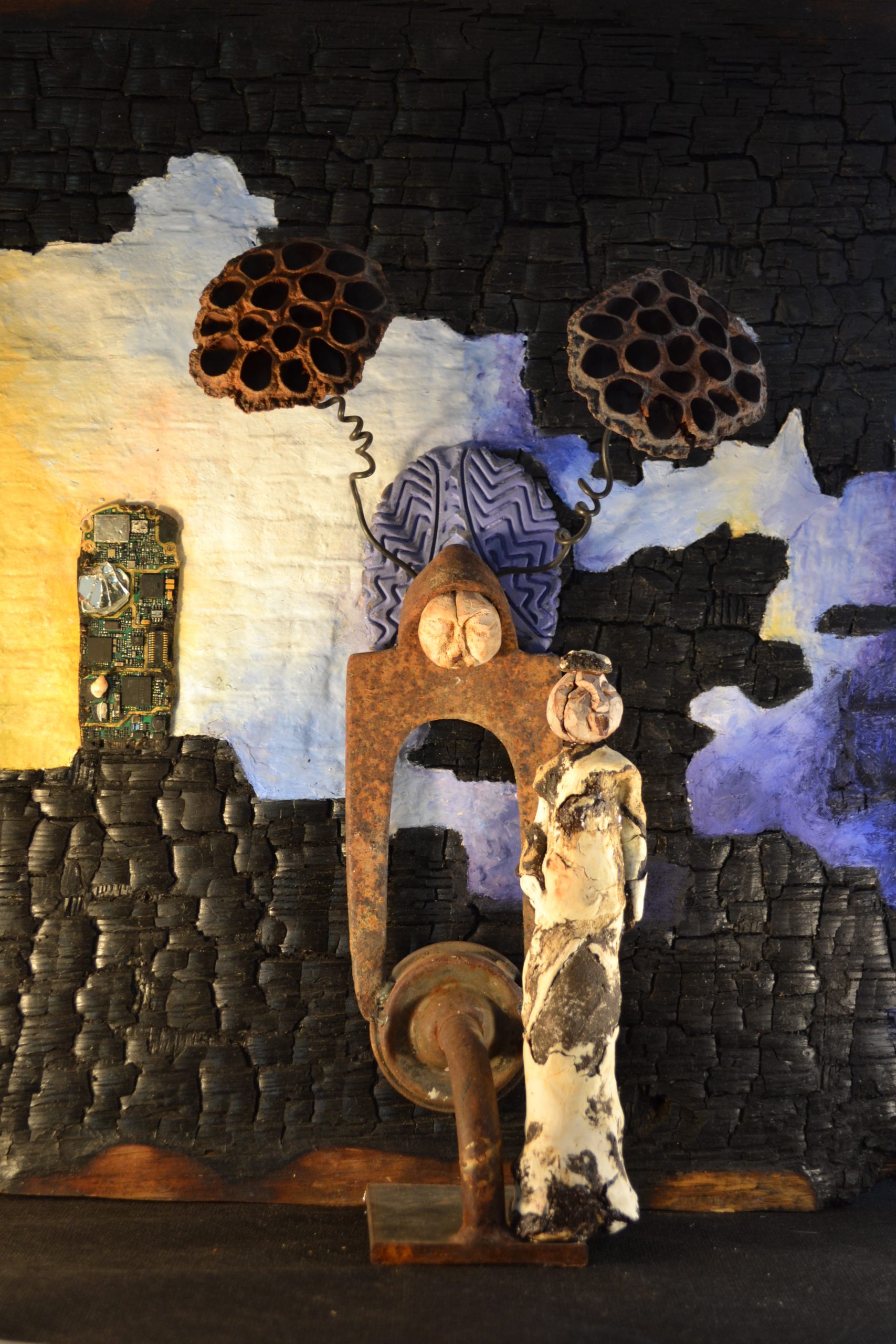 (bois, vieux outils,téléphone portable, graines, grès et matériaux divers)