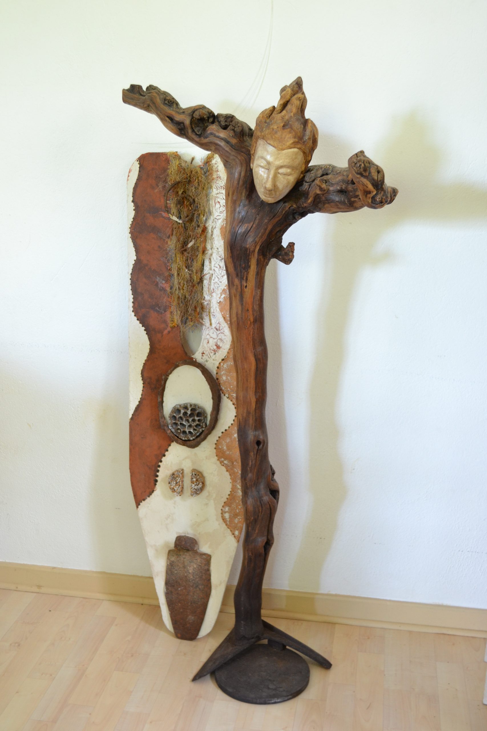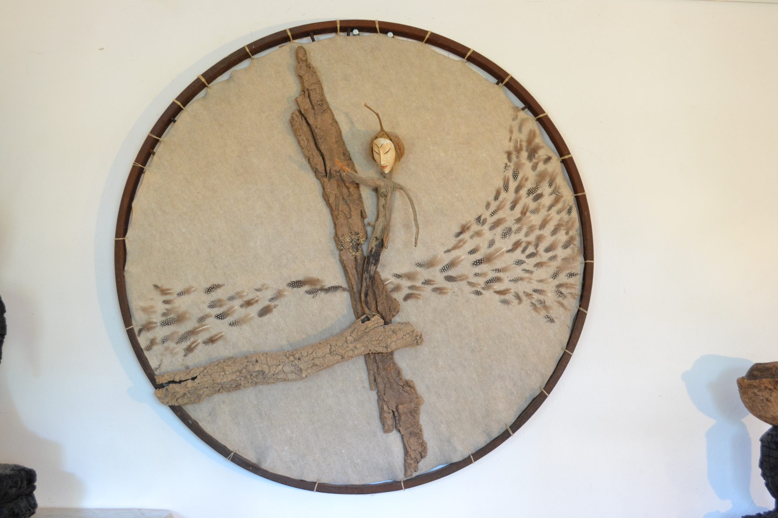 Mon travail est fait de sculptures, de tissages, d’assemblages en tous genres pour faire chanter la matière ; mais aussi de peintures corporelles comme allégorie de la nature dont nous sommes partie, de projets culturels et d’ateliers artistiques.
