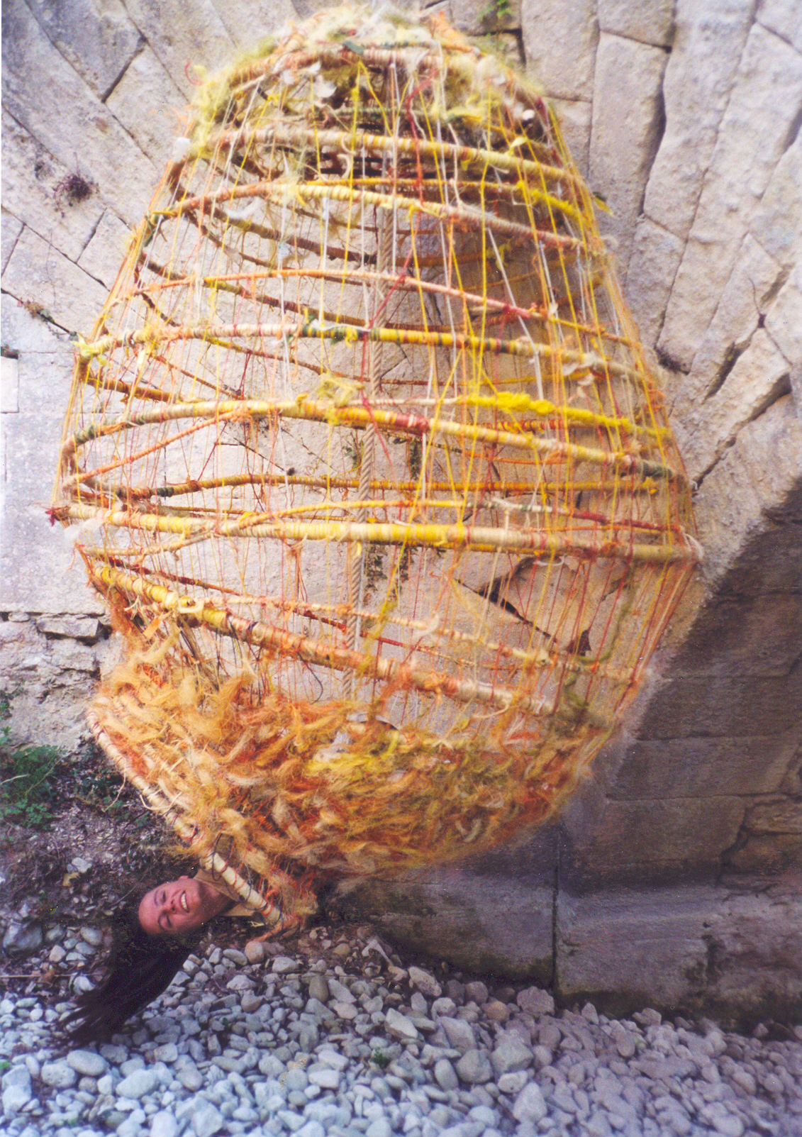 réalisé pour un spectacle de danse, comportant une double nacelle intérieure (sisal, lin, coton, rotin …)